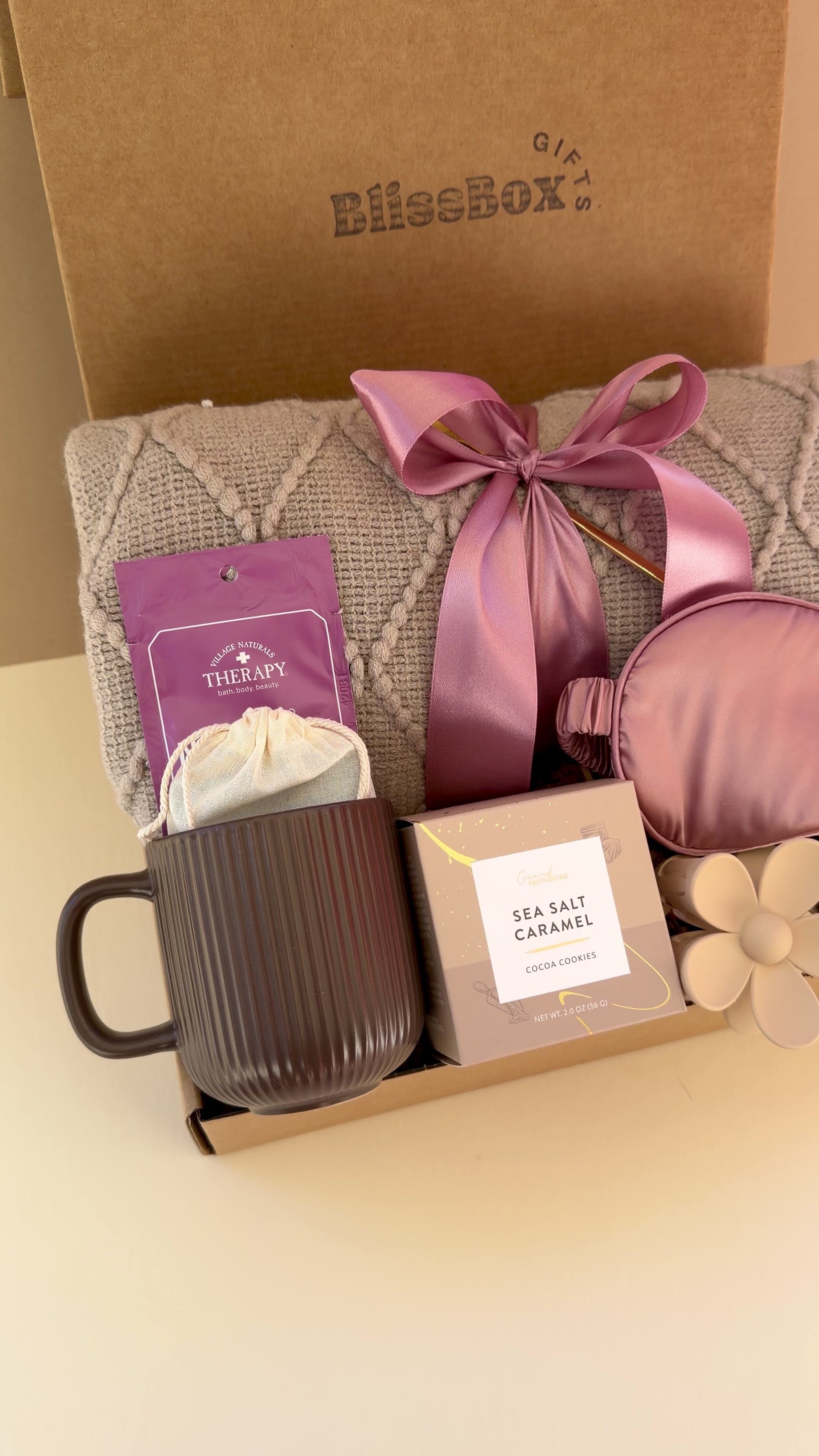 Each Tender Pause Box arrives in our signature BlissBox Gifts packaging, lovingly arranged with a luxurious pink satin ribbon bow. It's gift-ready the moment it arrives - no additional wrapping needed!